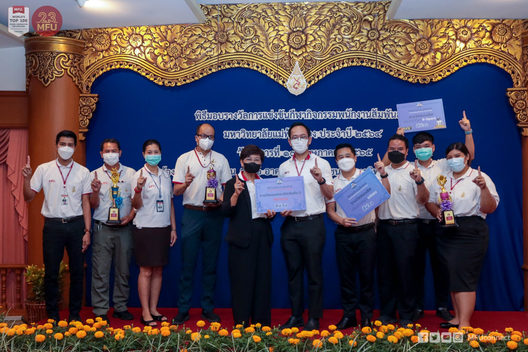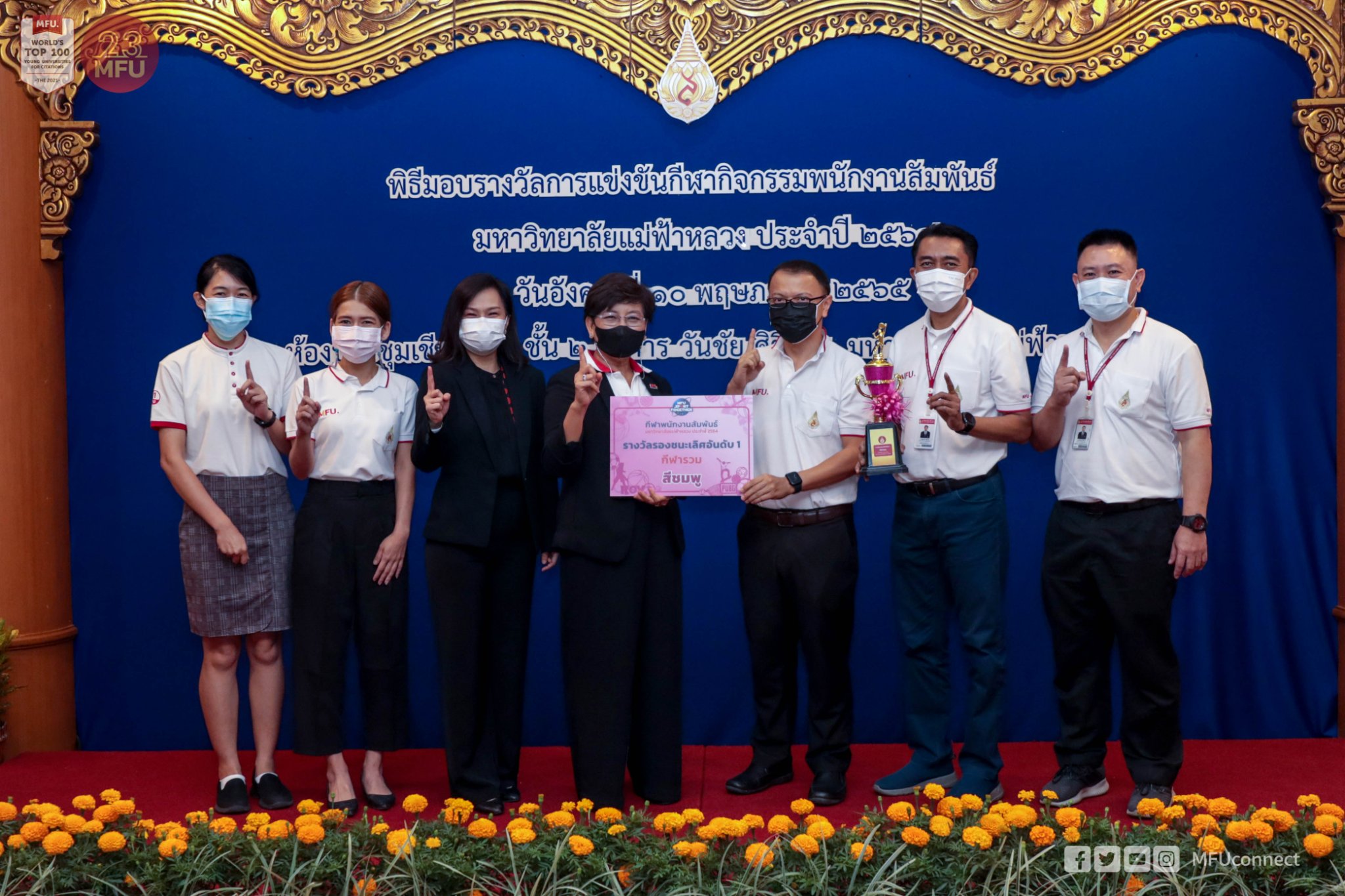 ส่วนการเจ้าหน้าที่ มหาวิทยาลัยแม่ฟ้าหลวง (มฟล.) จัด พิธีมอบรางวัลการแข่งขันกีฬา ในกิจกรรมพนักงานสัมพันธ์ มหาวิทยาลัยแม่ฟ้าหลวง ประจำปี 2564 เมื่อวันอังคารที่ 10 พฤษภาคม 2565 ณ ห้องประชุมเชียงแสน อาคารวันชัย ศิริชนะ ซึ่งจัดการแข่งขันระหว่างเดือนพฤศจิกายนถึงเดือนธันวาคม 2564 โดยแบ่งกลุ่มบุคลากรของสำนักวิชาและหน่วยงานต่างๆ ออกเป็น 4 สี คือ สีฟ้า สีชมพู สีม่วง และสีเขียว ทำการแข่งขันกีฬา 7 ชนิด คือ e-sport แชร์บอล surf skate ฟุตบอล เปตอง บาสเกตบอล และแบดมินตัน ทั้งนี้ ในพิธีมอบรางวัลการแข่งขันได้รับเกียรติจาก รศ. ดร.ชยาพร วัฒนศิริ อธิการบดี เป็นประธานในพิธี อาจารย์ ดร.พฤทธิ์ พุฒจร ผู้ช่วยอธิการบดี และประธานคณะทำงานโครงการพนักงานสัมพันธ์มหาวิทยาลัยแม่ฟ้าหลวง ประจำปี 2564 กล่าวรายงาน และมีคณะผู้บริหาร ผู้แทนจากสีต่างๆ เข้าร่วมพิธี นอกจากนี้ยังมีการถ่ายทอดการมอบรางวัลผ่านช่องทางออนไลน์ Zoom Meeting อีกด้วย