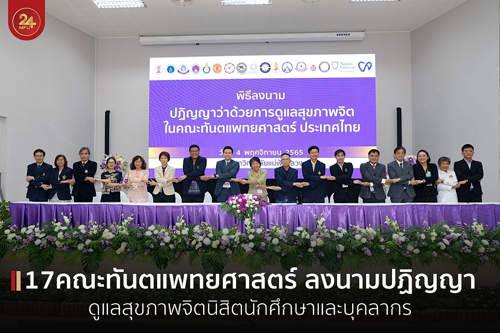 มหาวิทยาลัยแม่ฟ้าหลวง (มฟล.) โดยสำนักวิชาทันตแพทยศาสตร์ จัดพิธีลงนามในปฏิญญาว่าด้วยการดูแลสุภาพจิตในคณะทันตแพทยศาสตร์ ประเทศไทย โดยมี ผศ.(พิเศษ) ทันตแพทย์ไพศาล กังวลกิจ คณบดีสำนักวิชาทันตแพทยศาสตร์ มฟล. ลงนามร่วมกับคณบดีคณะทันตแพทยศาสตร์ 17 แห่งจากทั่วประเทศ เมื่อวันศุกร์ที่ 4 พฤศจิกายน 2565 เวลา 10.00 -12.00 น. ที่ห้องประดู่แดง1 อาคารพลเอก สำเภา ชูศรี มหาวิทยาลัยแม่ฟ้าหลวง