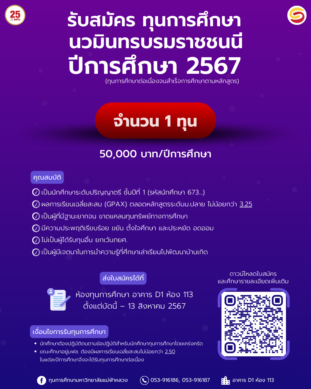 นักศึกษาส่งใบสมัครได้ที่ห้องทุนการศึกษา ห้อง 113 อาคาร D1 ได้ตั้งแต่บัดนี้ – 13 สิงหาคม 2567