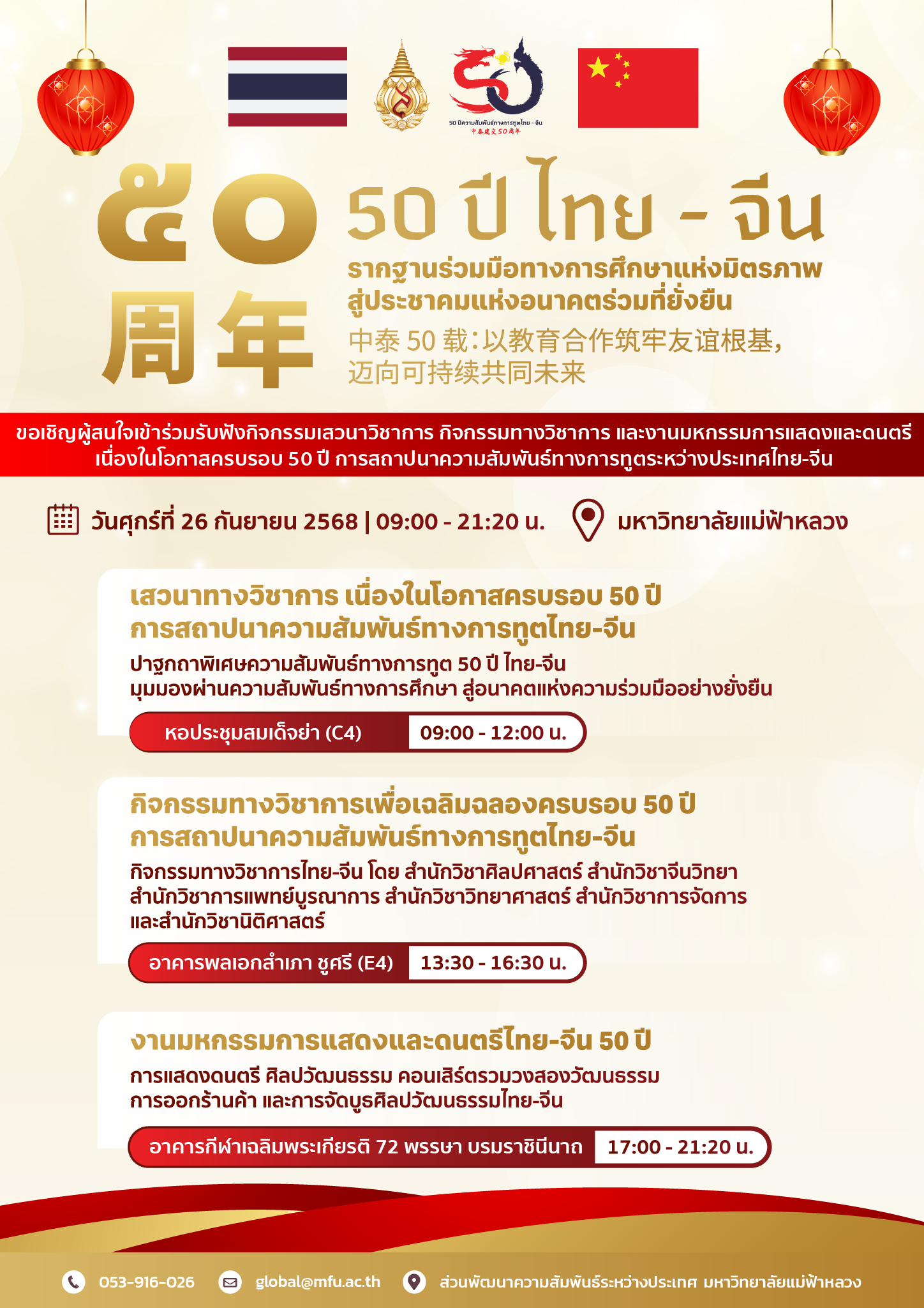 มหาวิทยาลัยแม่ฟ้าหลวงขอเชิญชวนประชาชนทุกท่านร่วมเฉลิมฉลองเหตุการณ์สำคัญทางประวัติศาสตร์ในงาน "50 ปี ไทย-จีน รากฐานความร่วมมือทางการศึกษาแห่งมิตรภาพ สู่ประชาคมแห่งอนาคตร่วมที่ยั่งยืน" ในวันศุกร์ที่ 26 กันยายน 2568 ณ มหาวิทยาลัยแม่ฟ้าหลวง จังหวัดเชียงราย