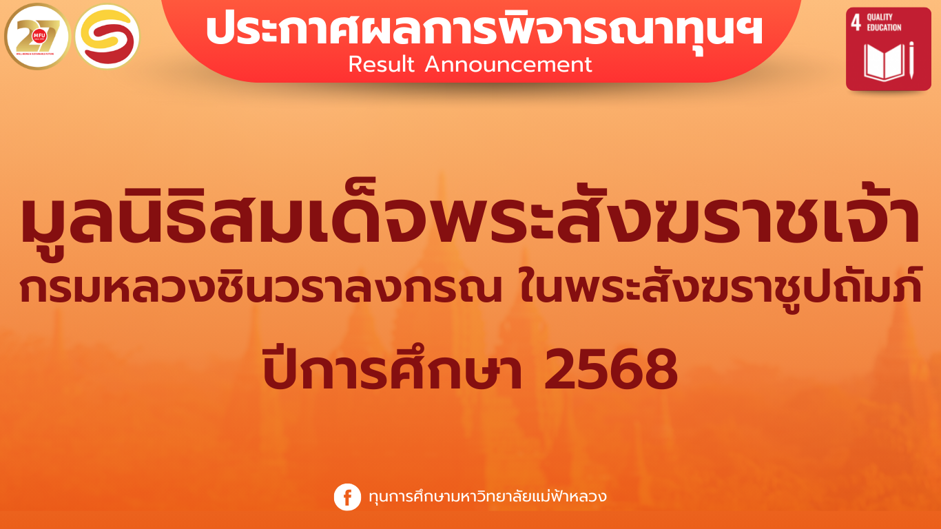 ผลการพิจารณาทุนการศึกษา มูลนิธิสมเด็จพระสังฆราชเจ้า กรมหลวงชินวราลงกรณ ในพระสังฆราชูปถัมภ์ ประจำปีการศึกษา 2568