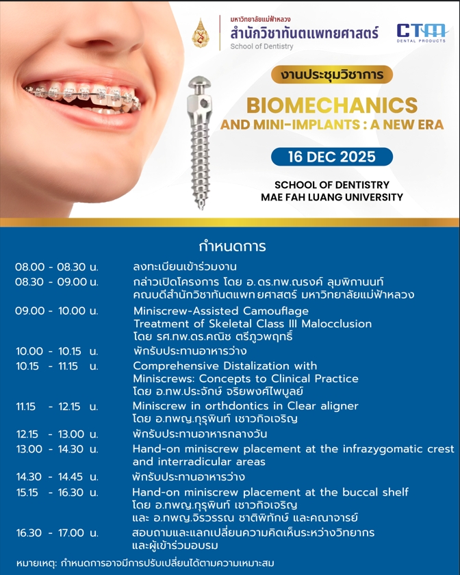 ในงานประชุมวิชาการนี้เราจะเจาะลึกถึงหลักการและการประยุกต์ใช้ Biomechanics และ Mini-Implants ที่เป็นเทคโนโลยีใหม่ในการรักษาทางทันตกรรม ซึ่งเหมาะสำหรับทันตแพทย์ทั่วไปที่ต้องการพัฒนาความรู้ในด้านนี้ โดยจะมีทั้งการบรรยายและการปฏิบัติจริงจากผู้เชี่ยวชาญในสาขานี้